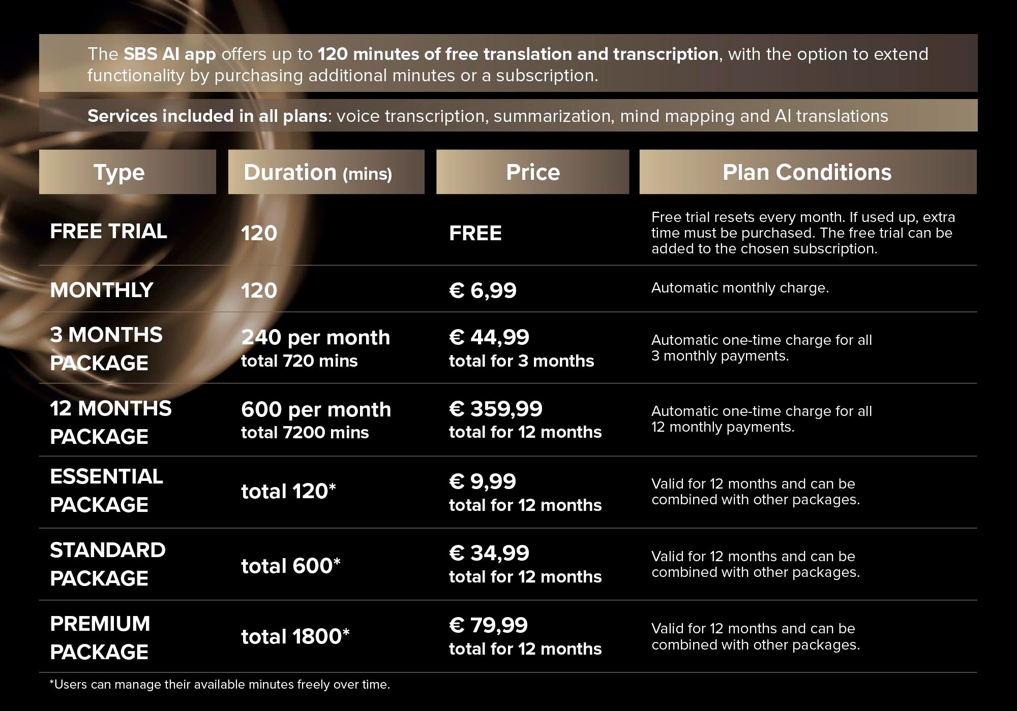 - 120 minutes free use with SBS AI Connect