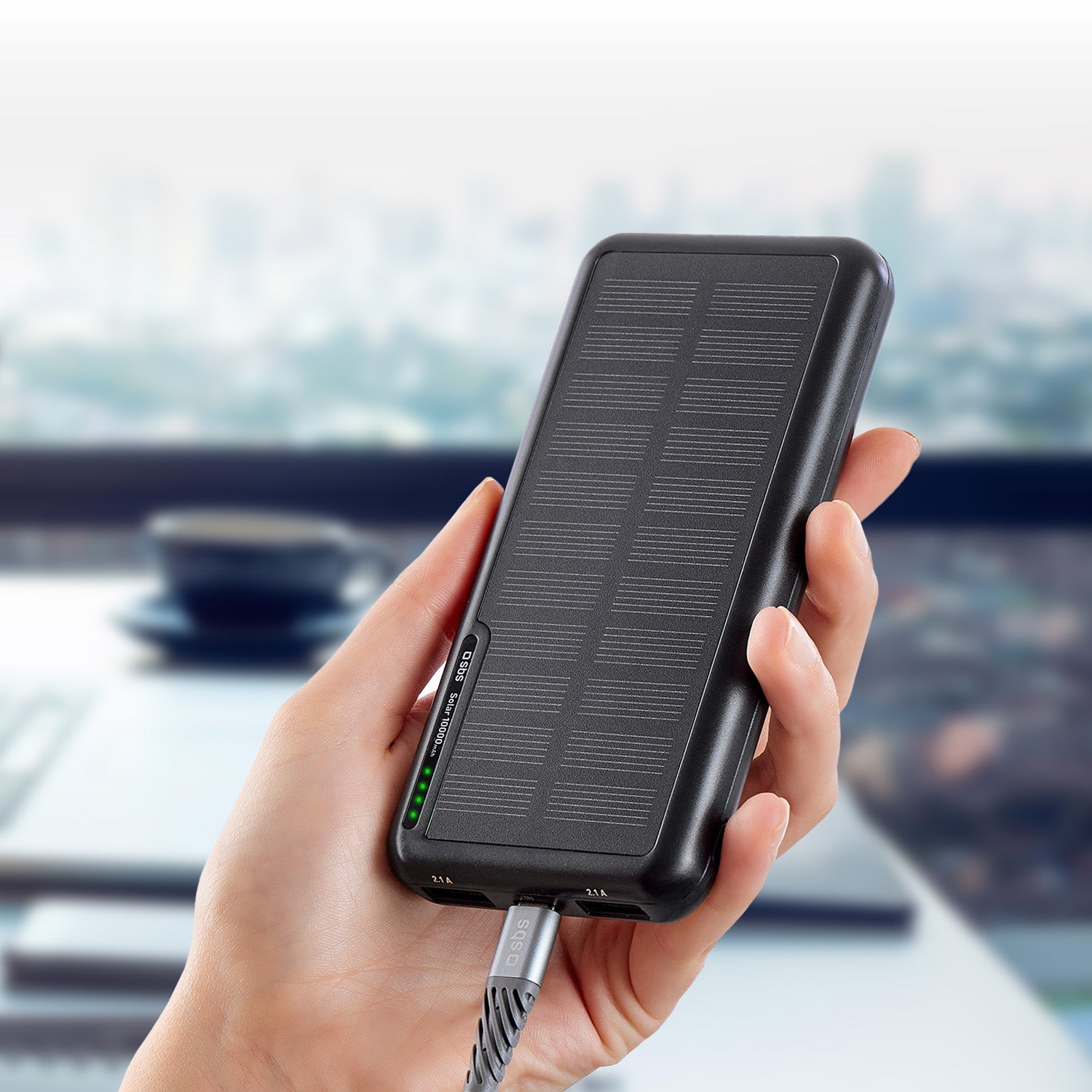 Cette méthode de charge vous permet de faire face à toutes les situations. La lumière du soleil alimente le panneau, et la powerbank peut ainsi recharger la batterie de votre téléphone jusqu'à 50 %.